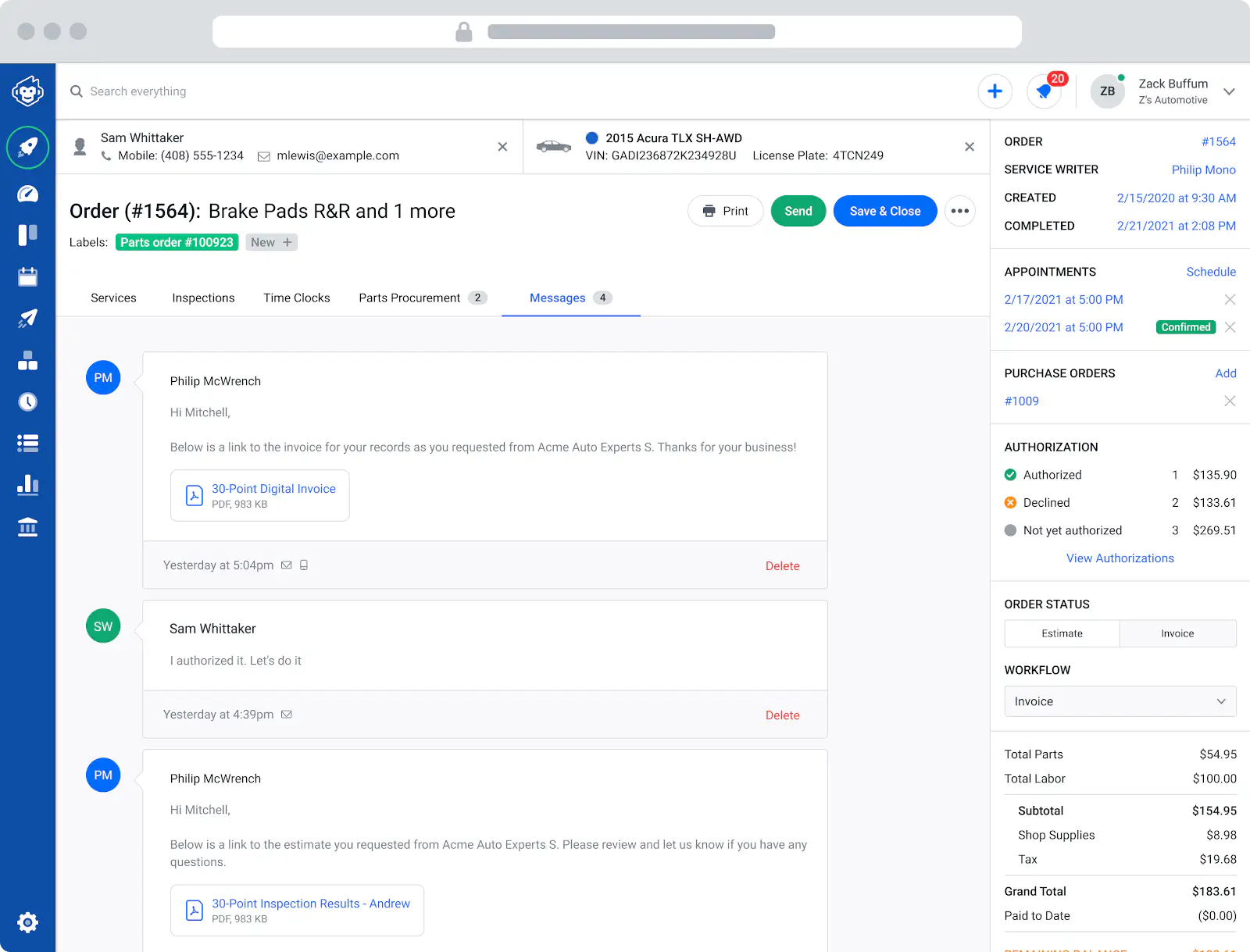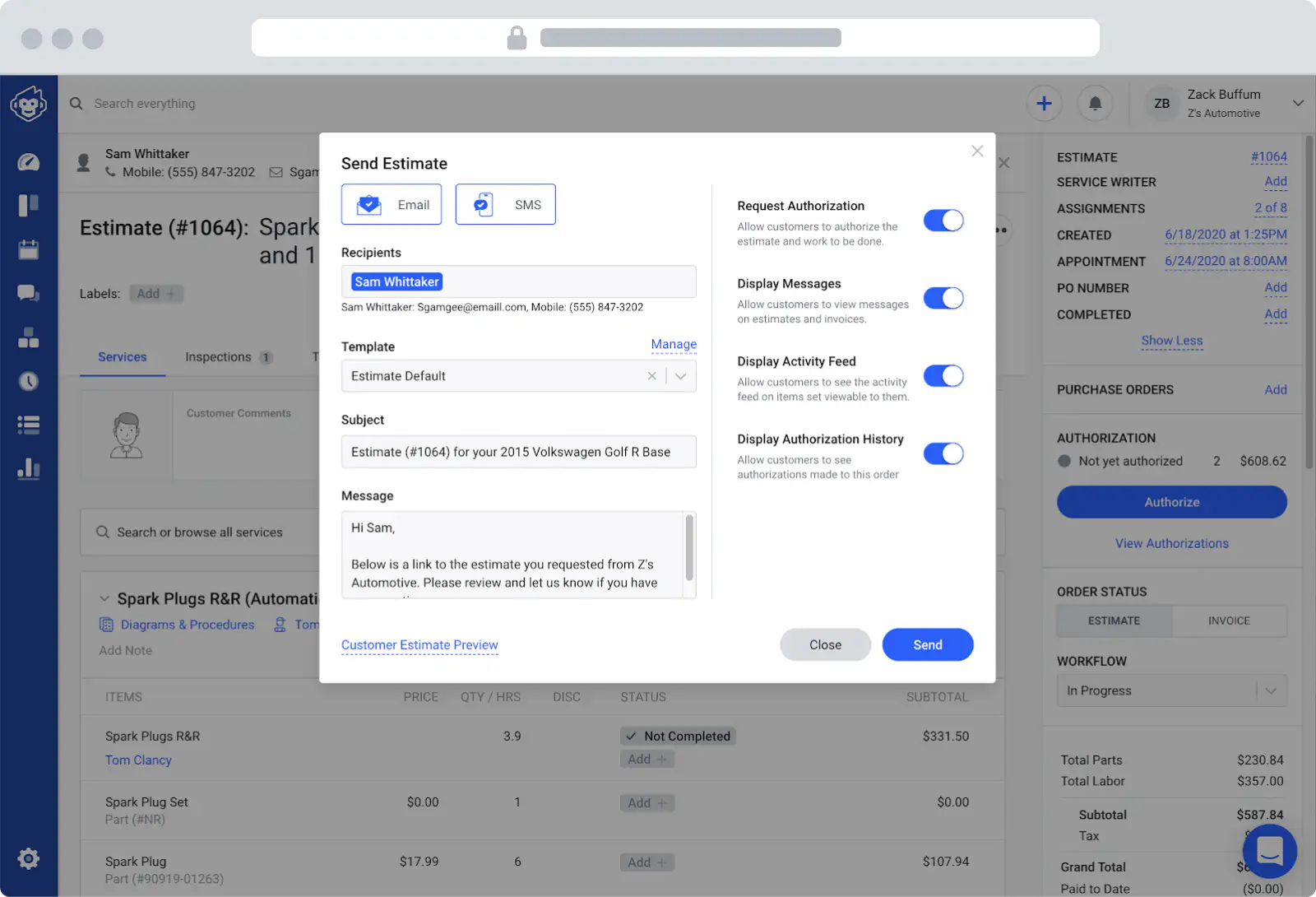 Let’s take a look at how easy it is to get an estimate approved through Shopmonkey Messages, while simultaneously documenting all messages to and from the customer.