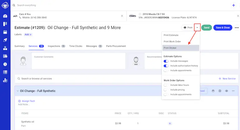 We added the print option to every work order to keep printing lightning fast. After setting up Oil Stickers, just open the print menu from any order, select “Print Sticker,” and make your selections.
