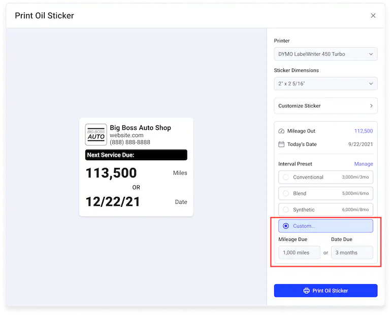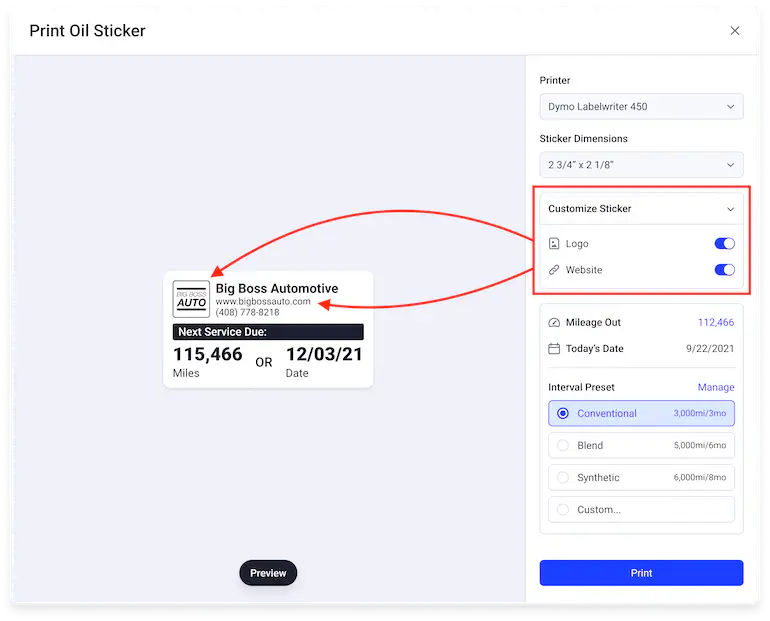 Here at Shopmonkey, we believe that the best part of returning customers is when they return to YOU. So, in addition to including your customer’s mileage and return date, we’ve designed our oil sticker feature to allow room for your shop’s logo, website, and phone number – to keep your shop top of mind! For a more simplified sticker, just turn these custom options off.