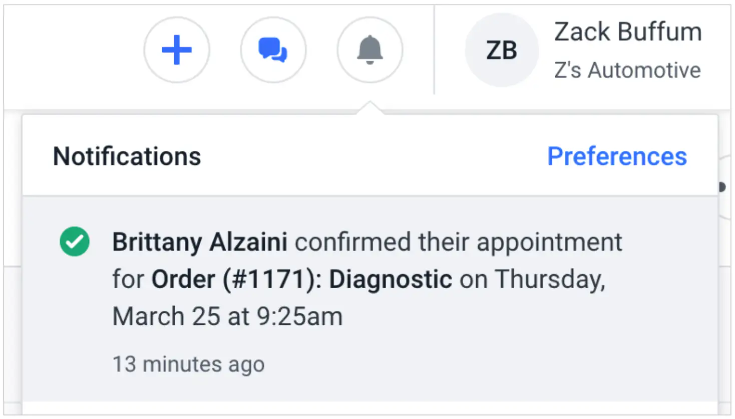 From within the Shopmonkey auto repair software, you will instantly be notified when a customer has confirmed or canceled their appointment. You can also view appointment confirmation status right on your shop calendar.