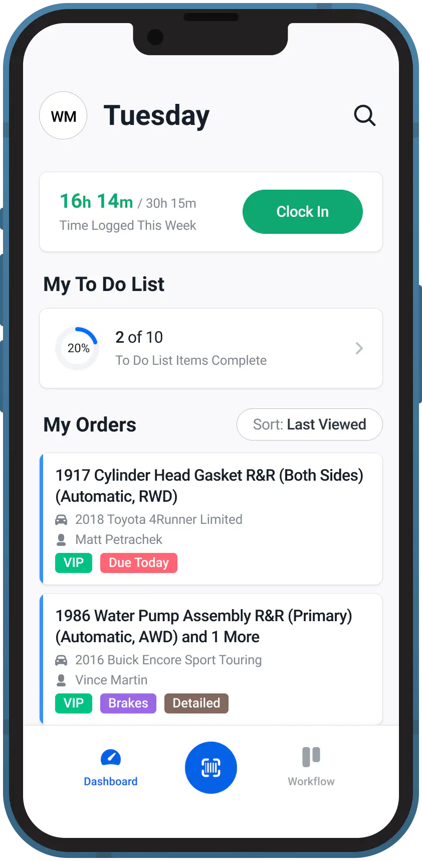 Front and center in our bottom navigation is access to our VIN plate, VIN barcode, and license plate scanner tool. Check-in vehicles faster than ever with this state-of-the-art scanner. One tap of a button gives techs the ability to check in a vehicle, access related jobs, or add a new vehicle to the system.